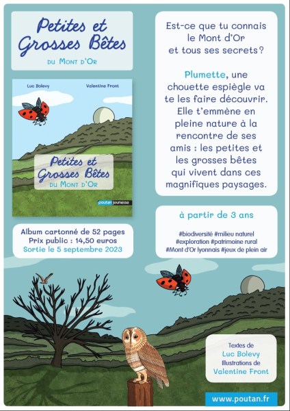 La première édition du livre « Petites et Grosses Bêtes du Mont d’Or » (paru en septembre 2023 aux Éditions Poutan Jeunesse) est désormais épuisée. Une seconde édition vient tout juste de paraître en septembre 2025 ! Retrouvez-la dans les librairies du Val de Saône.