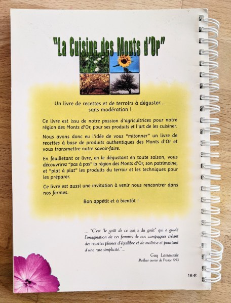La cuisine des Mont d’Or est un petit livre de recettes proposées par un groupe d’agricultrices réunies dans le GDAF (Groupement d’Etudes et de Développement Agricole Féminin) des Monts d’Or. Si la parution de ce recueil remonte déjà à 2001, ce livre de cuisine n’a pas pris une ride, c’est la raison pour laquelle nous avons souhaité lui consacrer ici quelques lignes.