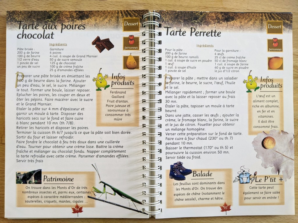Ces agricultrices nous proposent une sélection de recettes simples et locales, héritées d’une tradition familiale et classées au fil des saisons. Ces recettes de cuisine du terroir donne bien entendu la part belle aux produits locaux que l’on peut se procurer pour l’essentiel directement après du producteur. Dans toutes les recettes proposées, ce sont en effet les produits de la ferme qui sont mis à l’honneur. Rien d’étonnant alors que de retrouver nombre de desserts aux pommes et poires par exemple, tant la culture arboricole caractérise les Monts d’Or, plus particulièrement du côté de Saint-Germain et de Chasselay.