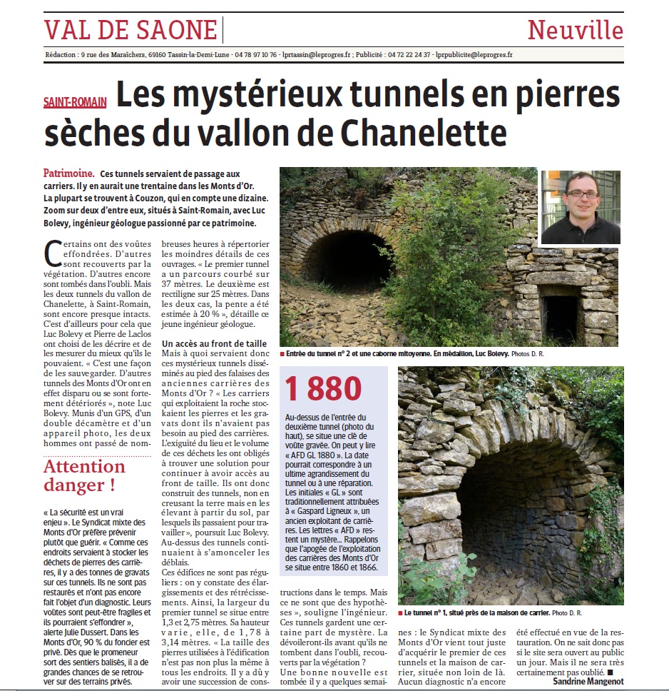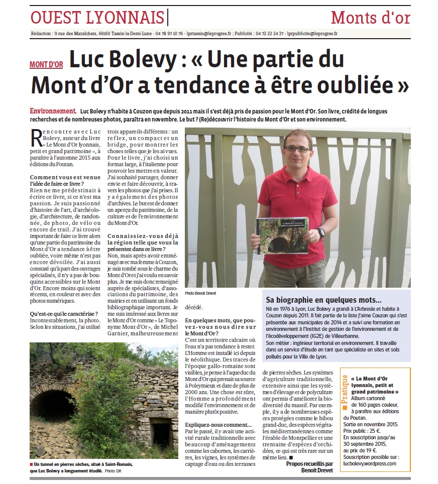 L’édition du Progrès du Val de Saône du 21 mars 2015 consacrait un article aux relevés réalisés en binôme avec Pierre de Laclos sur deux tunnels de pierre sèche de Saint-Romain. Des éléments du patrimoine rural encore relativement méconnus et néanmoins caractéristiques du Mont d’Or… Ce sujet sera t-il abordé dans le livre ? Réponse à l’issue de la souscription !