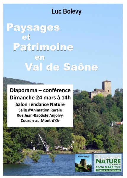 A l’occasion du Salon Tendance Nature de Couzon-au-Mont-d’Or, j’ai le plaisir de vous proposer un nouveau diaporama-conférence portant sur les paysages et du patrimoine du Val de Saône. Depuis Genay jusqu’à l’Ile Barbe, en passant par Neuville-sur-Saône, Rochetaillée, Albigny, Couzon, Caluire… le Val de Saône recèle en effet des paysages naturels de grande qualité et un patrimoine bâti parfois méconnu.